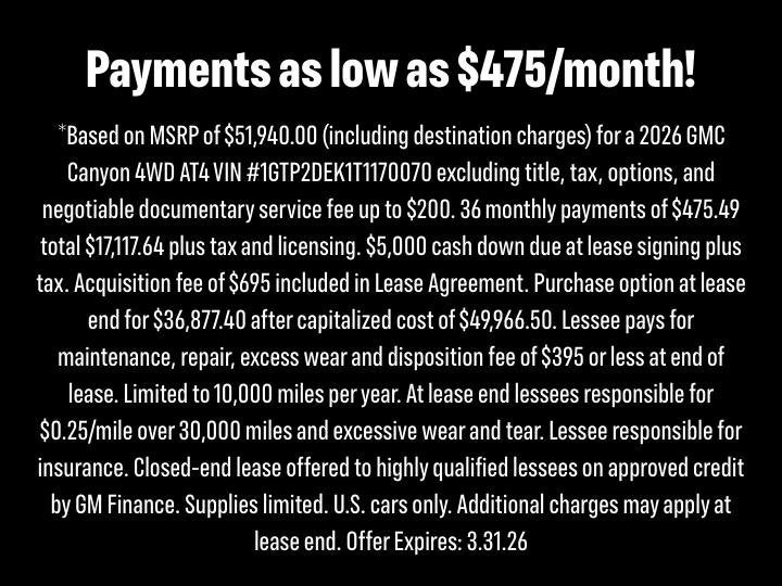 2026 GMC Canyon AT4$750 off MSRP! 4WD.Harnish Difference means Oil Changes and Powertrain warranty for life. Some Vehicles may have aftermarket items with additional cost, See dealer for details. Come see us for a hassle free buying experience. Price includes: $750 - Buick & GMC Consumer Cash Program. Exp. 03/31/2026