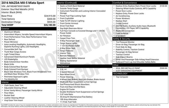 The 2016 Mazda Miata Sport comes equipped with the following upgrades and options: