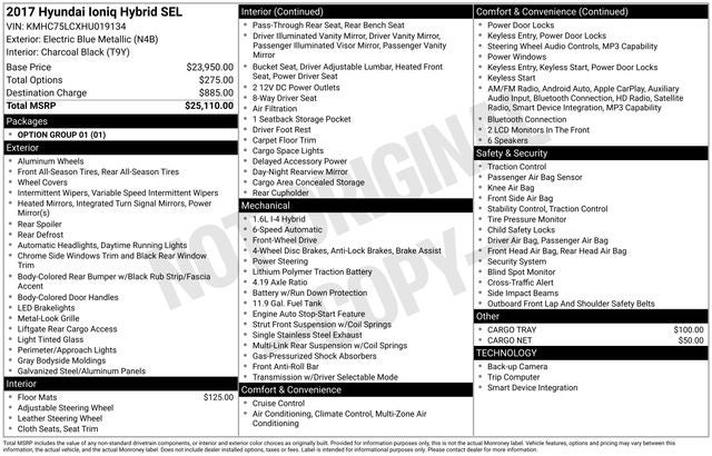 *EXCEPTIONAL SERVICE HISTORY, *HYBRID, *LOW NET COST OF OWNERSHIP, *FWD, *PREMIUM PACKAGE, *TECH PKG., *HEATED SEATS, *APPLE CARPLAY, *Bluetooth®, *PRIVACY GLASS / TINT, *AWESOME FUEL ECONOMY, Ioniq Hybrid SEL, 1.6L I4 DGI Hybrid DOHC 16V LEV3-SULEV30, 6-Speed EcoShift Dual Clutch, FWD, Electric Blue Metallic, Charcoal Black w/Premium Cloth Seating Surfaces, Alloy wheels, Apple CarPlay & Android Auto, Automatic temperature control, Brake assist, Exterior Parking Camera Rear, Fully automatic headlights, Heated door mirrors, Heated Front Bucket Seats, Illuminated entry, Radio: 7 Touch-Screen Display Audio, Security system, Split folding rear seat, Steering wheel mounted audio controls, Telescoping steering wheel, Tilt steering wheel, Turn signal indicator mirrors, 4-Wheel Disc Brakes, 6 Speakers, ABS brakes, Air Conditioning, AM/FM radio: SiriusXM, Bodyside moldings, Bumpers: body-color, Cargo Net, Cargo Tray, Carpet Floor Mats, Delay-off headlights, Driver door bin, Driver vanity mirror, Dual front impact airbags, Dual front side impact airbags, Electronic Stability Control, Four wheel independent suspension, Front anti-roll bar, Front Bucket Seats, Front Center Armrest, Front dual zone A/C, Front reading lights, Heated front seats, Knee airbag, Leather Shift Knob, Low tire pressure warning, Occupant sensing airbag, Option Group 01, Outside temperature display, Overhead airbag, Overhead console, Passenger door bin, Passenger vanity mirror, Power door mirrors, Power driver seat, Power steering, Power windows, Premium Cloth Seating Surfaces, Rear seat center armrest, Rear window defroster, Remote keyless entry, Speed control, Speed-sensing steering, Spoiler, Tachometer, Traction control, Trip computer, Variably intermittent wipers, Ioniq Hybrid SEL, 1.6L I4 DGI Hybrid DOHC 16V LEV3-SULEV30, 6-Speed EcoShift Dual Clutch, FWD, Electric Blue Metallic, Charcoal Black w/Premium Cloth Seating Surfaces, Alloy wheels, Apple CarPlay & Android Auto, Automatic temperature control, Brake assist, Exterior Parking Camera Rear, Fully automatic headlights, Heated door mirrors, Heated Front Bucket Seats, Illuminated entry, Radio: 7 Touch-Screen Display Audio, Security system, Split folding rear seat, Steering wheel mounted audio controls, Telescoping steering wheel, Tilt steering wheel, Turn signal indicator mirrors.