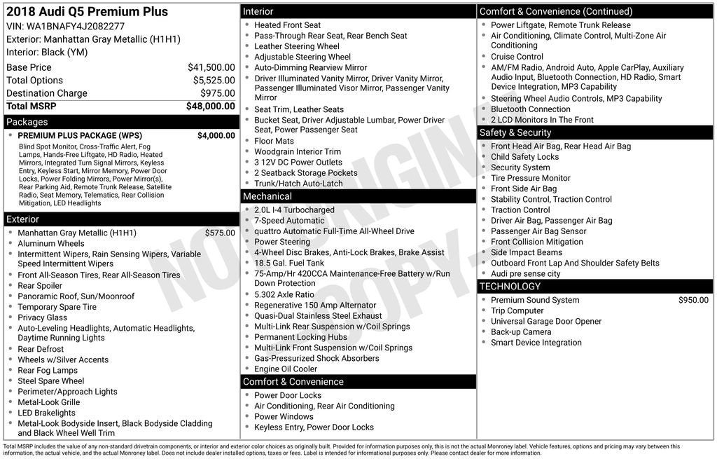 Experience the Difference at Chevrolet of Puyallup. As one of the top dealers in the NW, we make it easy. With Care-Free Maintenance , No Worry Warranties, Accessory Discounts and the best Customer Rewards Program in the NW. 2018 Audi Q5 2.0T Premium Plus {Exterior Color}