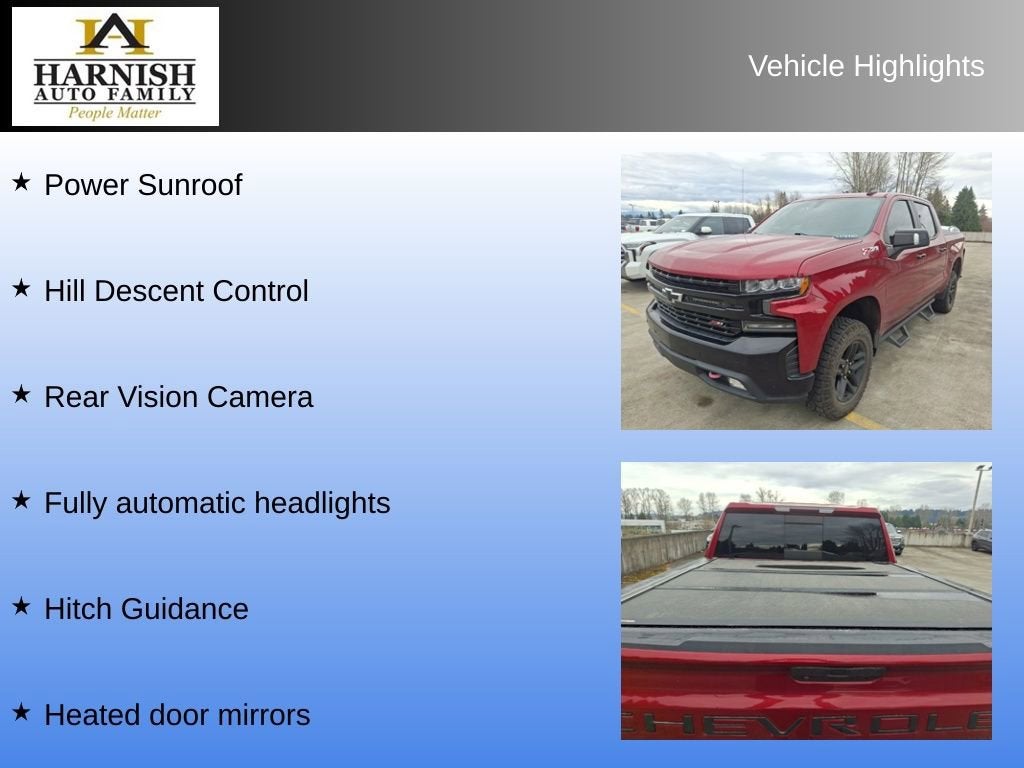 2020 Chevrolet LT Trail Boss Silverado 1500Cajun Red Tintcoat4WDClean CARFAX.16/22 City/Highway MPGExperience the Difference at Chevrolet of Puyallup. As one of the top dealers in the NW, we make it easy. With Care-Free Maintenance , No Worry Warranties, Accessory Discounts and the best Customer Rewards Program in the NW. 2020 Chevrolet Silverado 1500 LT Trail Boss {Exterior Color}Experience the Difference at Chevrolet of Puyallup. As one of the top dealers in the NW, we make it easy. With Care-Free Maintenance , No Worry Warranties, Accessory Discounts and the best Customer Rewards Program in the NW. With over 30 years of serving our communities transportation and service needs.10-Speed Automatic, 4WD, Black Leather, Apple CarPlay/Android Auto, Front Bucket Seats, Fully automatic headlights, Heated door mirrors, Heated Driver & Front Outboard Passenger Seats, Heated Steering Wheel, Hill Descent Control, Hitch Guidance, Integrated Trailer Brake Controller, Power Sliding Rear Window w/Rear Defogger, Power Sunroof, Rear 60/40 Folding Bench Seat (Folds Up), Rear Vision Camera.
