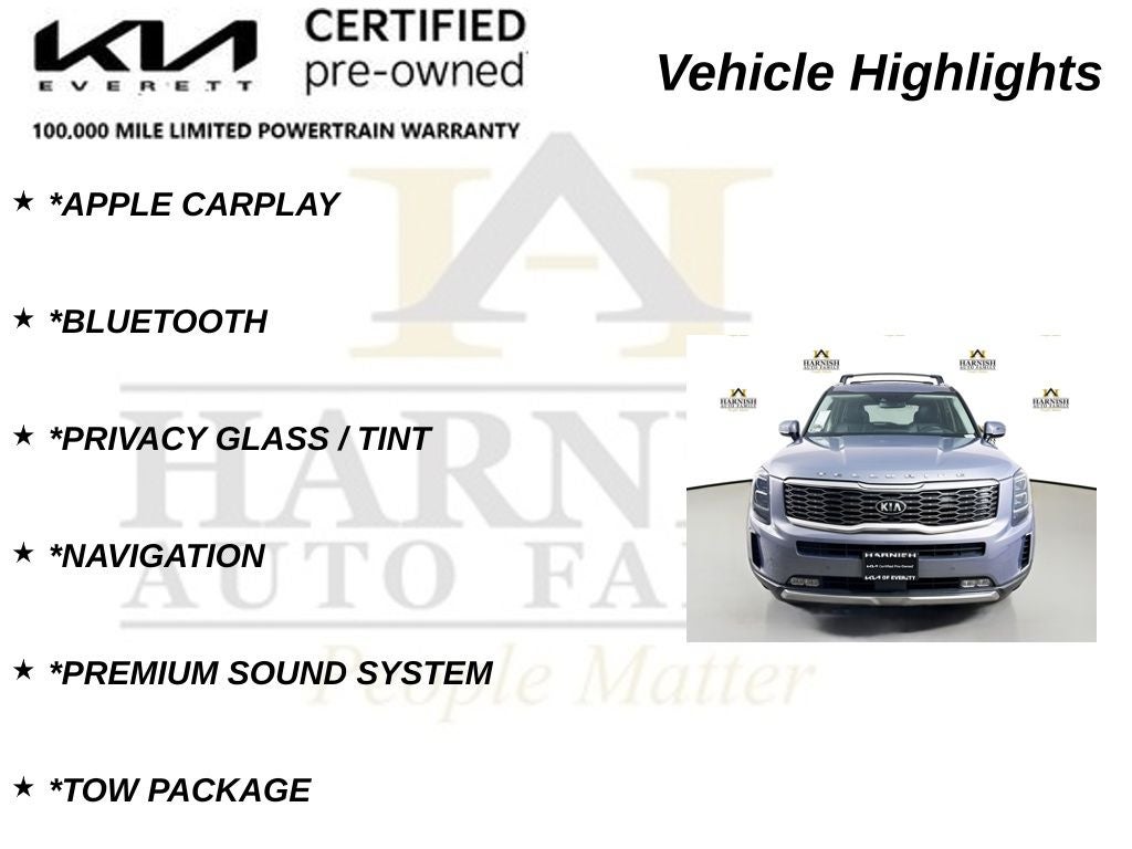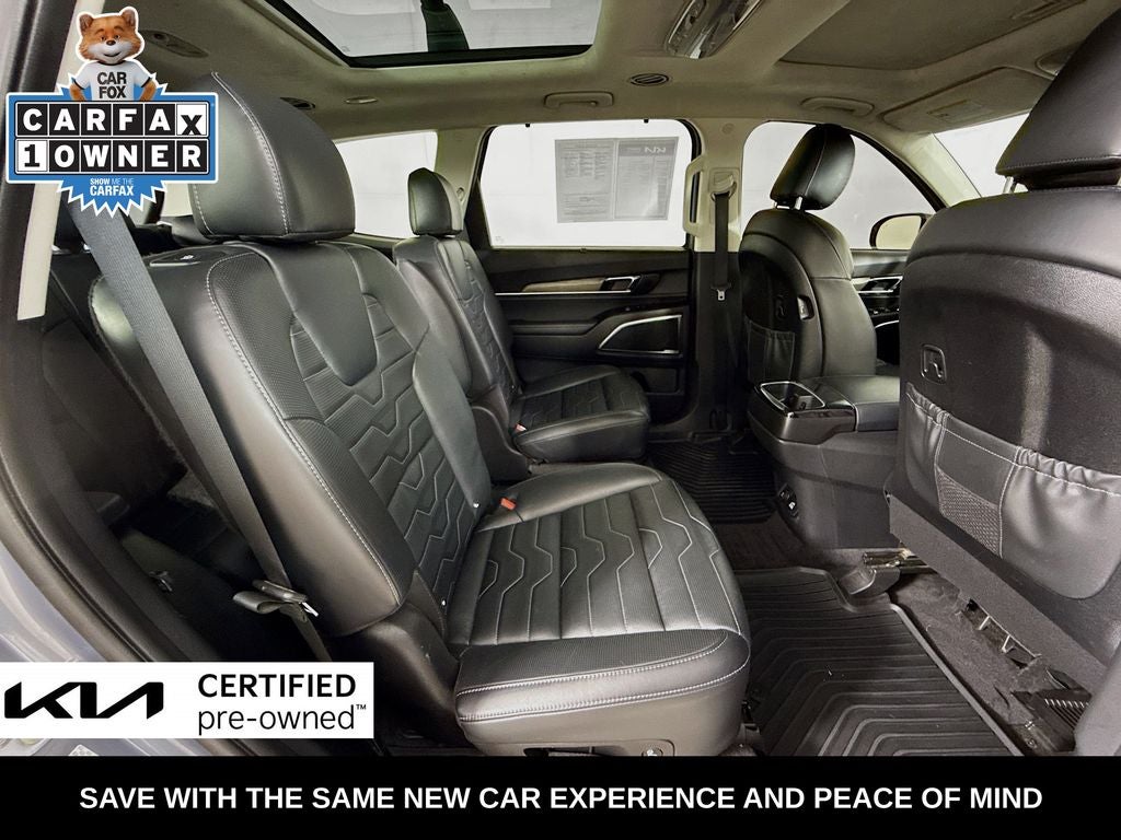 As a Kia Certified Pre-Owned vehicle, this Telluride SX has undergone a rigorous 165-point inspection and comes with an extensive warranty package, including a 12-month/12,000-mile Platinum Coverage limited warranty and a 120-month/100,000-mile powertrain limited warranty from the original in-service date. Additionally, you'll enjoy the peace of mind of Roadside Assistance, a $50 warranty deductible, and a 3-month SiriusXM trial subscription.