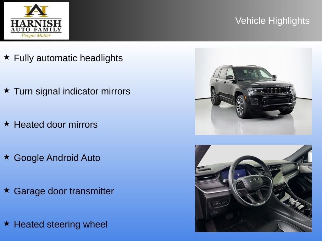 2022 Jeep Overland Grand Cherokee LDiamond Black Crystal Pearlcoat4WDCARFAX One-Owner.Clean CARFAX.18/25 City/Highway MPGPriced below KBB Fair Purchase Price!Experience the Difference at Chevrolet of Puyallup. As one of the top dealers in the NW, we make it easy. With Care-Free Maintenance , No Worry Warranties, Accessory Discounts and the best Customer Rewards Program in the NW. 2022 Jeep Grand Cherokee L Overland {Exterior Color}Experience the Difference at Chevrolet of Puyallup. As one of the top dealers in the NW, we make it easy. With Care-Free Maintenance , No Worry Warranties, Accessory Discounts and the best Customer Rewards Program in the NW. With over 30 years of serving our communities transportation and service needs.Fully automatic headlights, Garage door transmitter, Google Android Auto, Heated door mirrors, Heated front seats, Heated steering wheel, Turn signal indicator mirrors, Ventilated front seats.