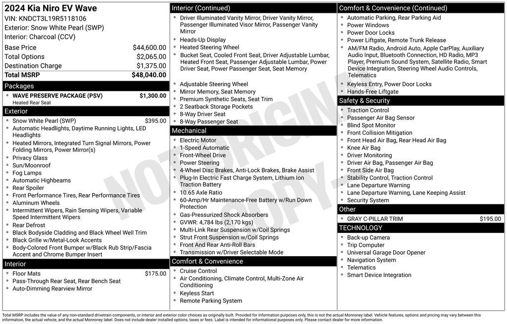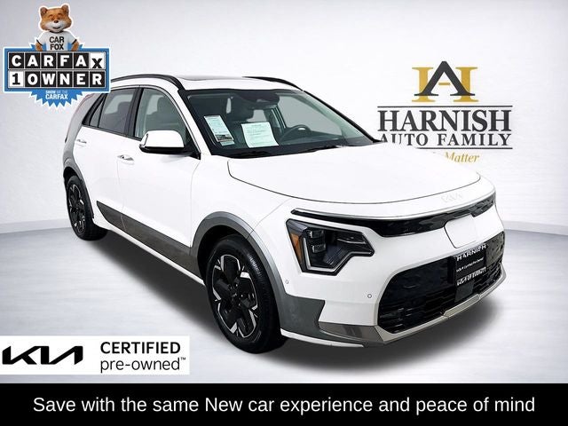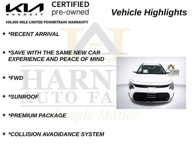 *RECENT ARRIVAL, *SAVE WITH THE SAME NEW CAR EXPERIENCE AND PEACE OF MIND, *FWD, *SUNROOF, *PREMIUM PACKAGE, *COLLISION AVAOIDANCE SYSTEM, *SYNTECH SEATS, *POWER LIFTGATE, *HEATED SEATS, *HEATED AND COOLED SEATS, *HEATED STEERING WHEEL, *APPLE CARPLAY, *Bluetooth®, *PRIVACY GLASS / TINT, *NAVIGATION, *HARMON KARDON SOUNDS, *PREMIUM SOUND SYSTEM, *TOP TIER TRIM LEVEL, Niro EV Wave, Kia Certified Pre-Owned Certified, Electric Motor, 1-Speed Automatic, FWD, Snow White Pearl, Charcoal Leather, 10.65 Axle Ratio, 4-Wheel Disc Brakes, 7J x 17 Alloy Wheels, 8 Speakers, ABS brakes, Air Conditioning, Alloy wheels, AM/FM radio: SiriusXM, Apple CarPlay & Android Auto, Auto High-beam Headlights, Auto-dimming Rear-View mirror, Automatic temperature control, Brake assist, Bumpers: body-color, Carpet Floor Mats, Delay-off headlights, Driver door bin, Driver vanity mirror, Dual front impact airbags, Dual front side impact airbags, Electronic Stability Control, Exterior Parking Camera Rear, Four wheel independent suspension, Front anti-roll bar, Front Bucket Seats, Front Center Armrest, Front dual zone A/C, Front fog lights, Front reading lights, Fully automatic headlights, Garage door transmitter: HomeLink, Gray C-Pillar Trim, harman/kardon® Speakers, Heads-Up Display, Heated & Ventilated Front Bucket Seats (3-Steps), Heated door mirrors, Heated front seats, Heated Rear Seats, Heated steering wheel, Illuminated entry, Knee airbag, Low tire pressure warning, Memory seat, Navigation System, Occupant sensing airbag, Outside temperature display, Overhead airbag, Overhead console, Passenger door bin, Passenger vanity mirror, Perforated Vegan Leather-Trimmed Seats, Power door mirrors, Power driver seat, Power passenger seat, Power steering, Power windows, Radio: harman/kardon Premium Audio System, Rain sensing wipers, Rear anti-roll bar, Rear seat center armrest, Rear window defroster, Rear window wiper, Remote keyless entry, Security system, Speed control, Speed-sensing steering, Split folding rear seat, Spoiler, Steering wheel mounted audio controls, Telescoping steering wheel, Tilt steering wheel, Traction control, Trip computer, Turn signal indicator mirrors, Variably intermittent wipers, Ventilated front seats, Wave Preserve Package, Niro EV Wave, Electric Motor, 1-Speed Automatic, FWD, Snow White Pearl, Charcoal Leather.