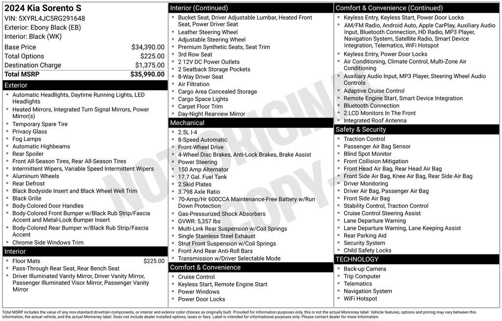 2024 Kia Sorento 2.5L I4 DGI DOHC 16V LEV3-SULEV30 191hp S Ebony Black