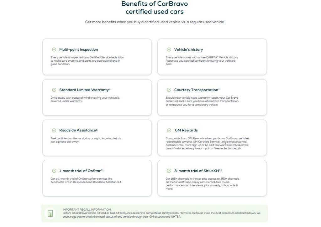 - Multi-point inspection: Enjoy peace of mind knowing that all CarBravo vehicles undergo a rigorous multi-point inspection. Also, before a CarBravo vehicle is listed or sold, dealers complete all safety recalls. You can also double-check the recall status of any vehicle at www.nhtsa.gov/recalls.